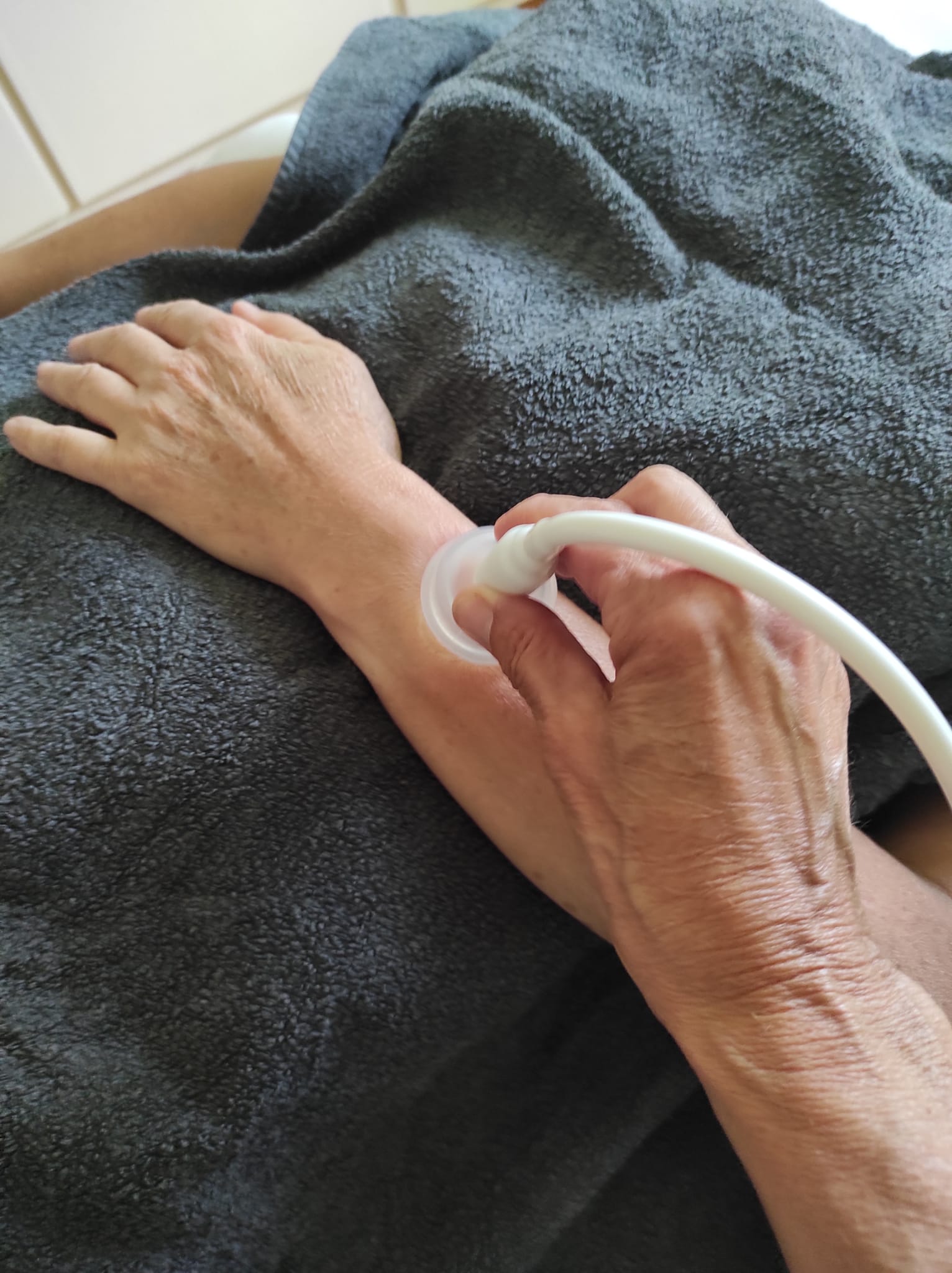 PNEUMATRON® arbeitet mit intermittierendem Unterdruck. Auf das Gewebe wird zunächst ein Dehnreiz ausgeübt (Unterdruck), der sofort wieder in eine Entspannungsphase (atmosphärischer Druck) übergeht. Das Gewebe kommt in Schwingung und in Bewegung. Durch den Unterdruck kommt es zum Ansaugen von Gewebeschichten und Muskulatur. Der ständige Impulswechsel sorgt für eine intensive Bearbeitung der betroffenen Gewebeabschnitte.